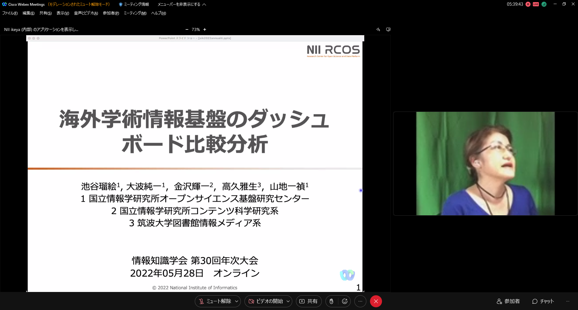 - 池谷瑠絵, 大波純一, 金沢輝一, 高久雅生, 山地一禎. 海外学術情報基盤のダッシュボード比較分析. 第30回情報知識学会年次大会, 情報知識学会誌, vol.32, no.2 (2022-05)