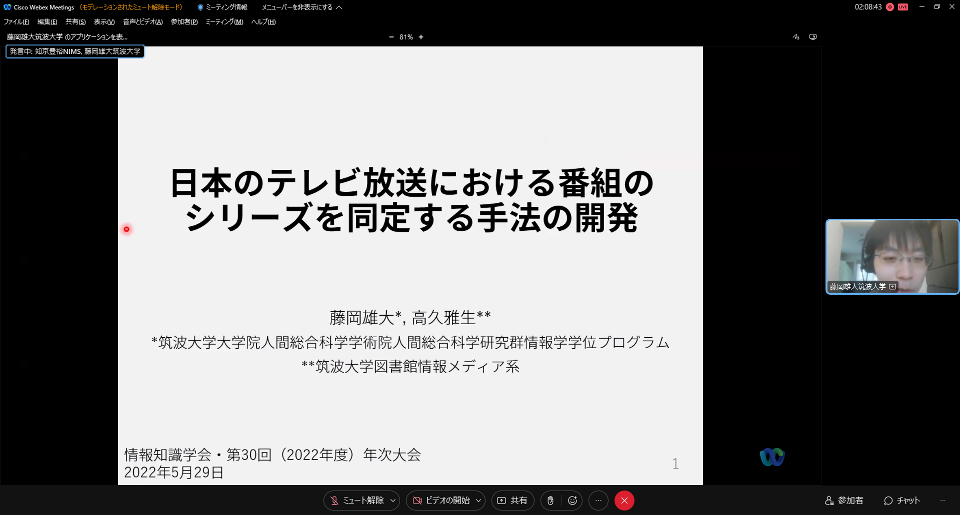 - 藤岡雄大, 高久雅生. 日本のテレビ放送における番組のシリーズを同定する手法の開発. 第30回情報知識学会年次大会, 情報知識学会誌, vol.32, no.2 (2022-05)