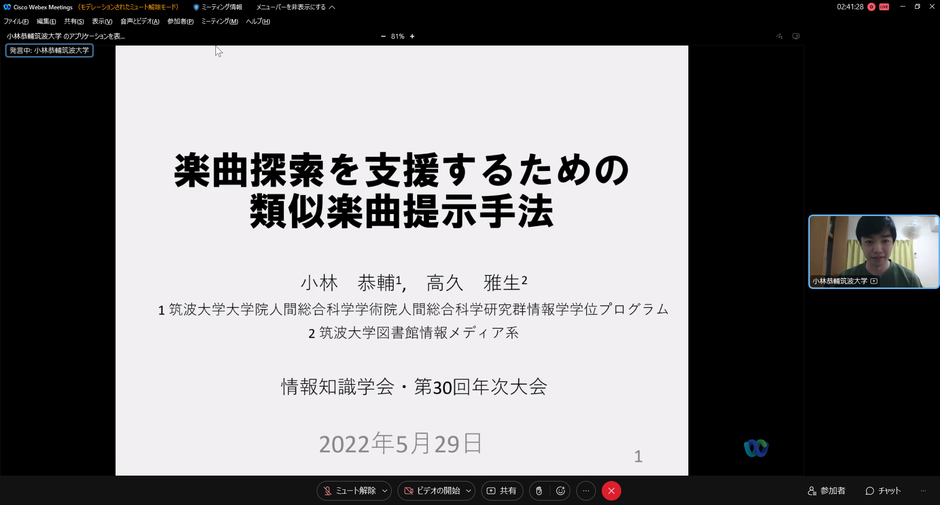 - 小林恭輔, 高久雅生. 楽曲探索を支援するための類似楽曲提示手法. 第30回情報知識学会年次大会, 情報知識学会誌, vol.32, no.2 (2022-05)