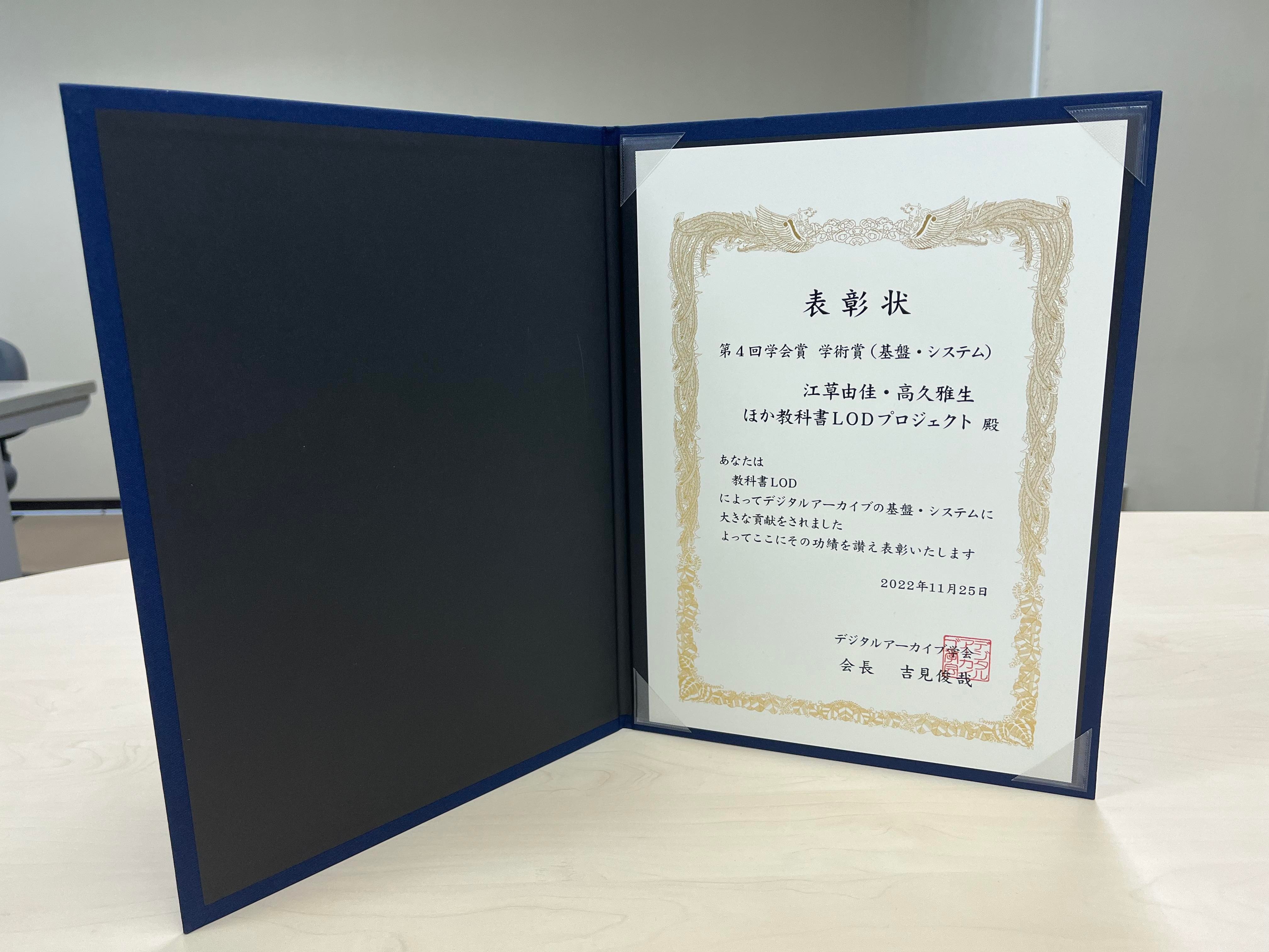 高久が2017年から開発・提供に参画してきた「教科書LOD」がデジタルアーカイブ学会第4回学会賞「学術賞 (基盤・システム)」を受賞しました。