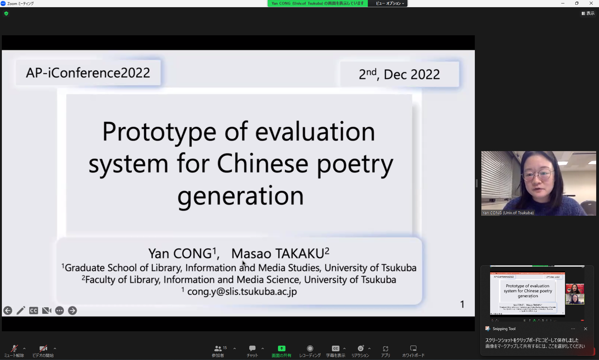 - Yan, CONG; Masao, TAKAKU: Prototype of evaluation system for Chinese poetry generation. AP-iConference 2022, オンライン.