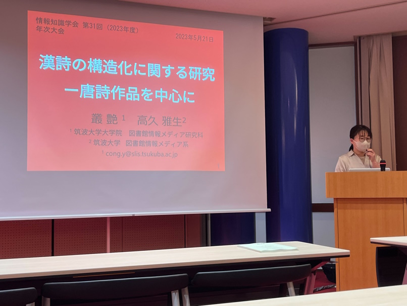 さらに、同大会の中で情報知識学会論文賞が発表され、叢艶、高久雅生による「漢詩の構造化に関する研究 -唐詩作品を中心に」(2022年32巻1号)が論文賞を受賞したことが報告され、叢さんによる記念講演が行われました。