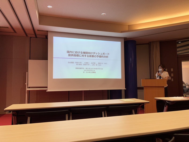 - 池谷瑠絵, 大波純一, 金沢輝一, 西岡千文, 高久雅生, 山地一禎. 国内における機関向けダッシュボード提供指標に対する需要の予備的調査. 第31回情報知識学会年次大会, 情報知識学会誌, vol.33, no.2, pp.254-263 (2023-05)
