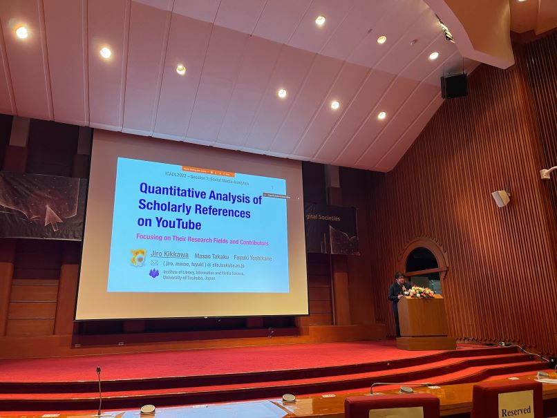 - Jiro Kikkawa, Masao Takaku, Fuyuki Yoshikane. Quantitative Analysis of Scholarly References on YouTube: Focusing on their Research Fields and Contributors. ICADL 2023, Taipei, Taiwan, Lecture Notes in Computer Science (LNCS), vol.14457, pp.149-158 (2023-12)
