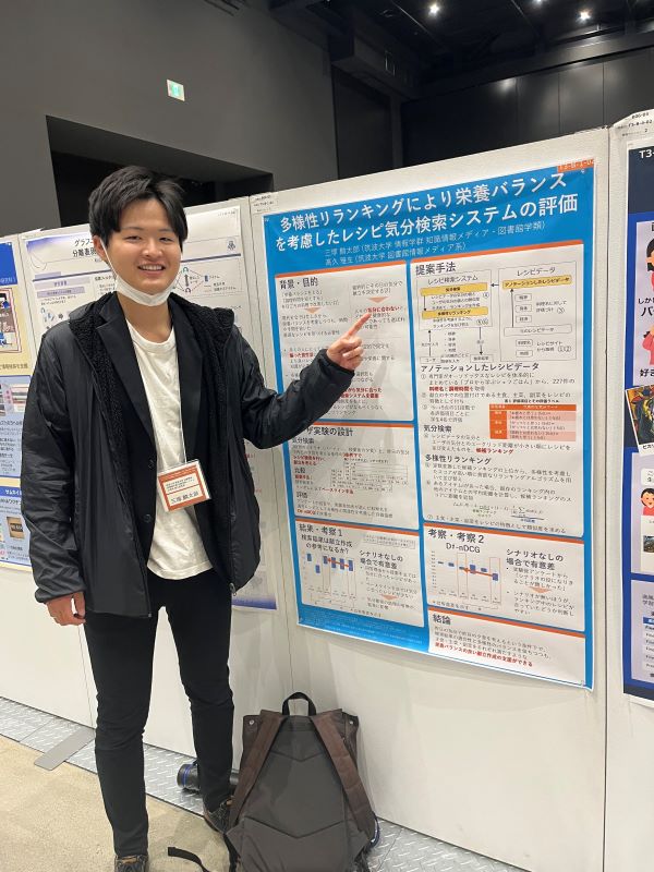 - 三塚麟太郎, 高久雅生. 多様性リランキングにより栄養バランスを考慮したレシピ気分検索システムの評価. 第16回データ工学と情報マネジメントに関するフォーラム (DEIM 2024), 姫路, article no. T3-B-1-02, 9p. (2024-02)