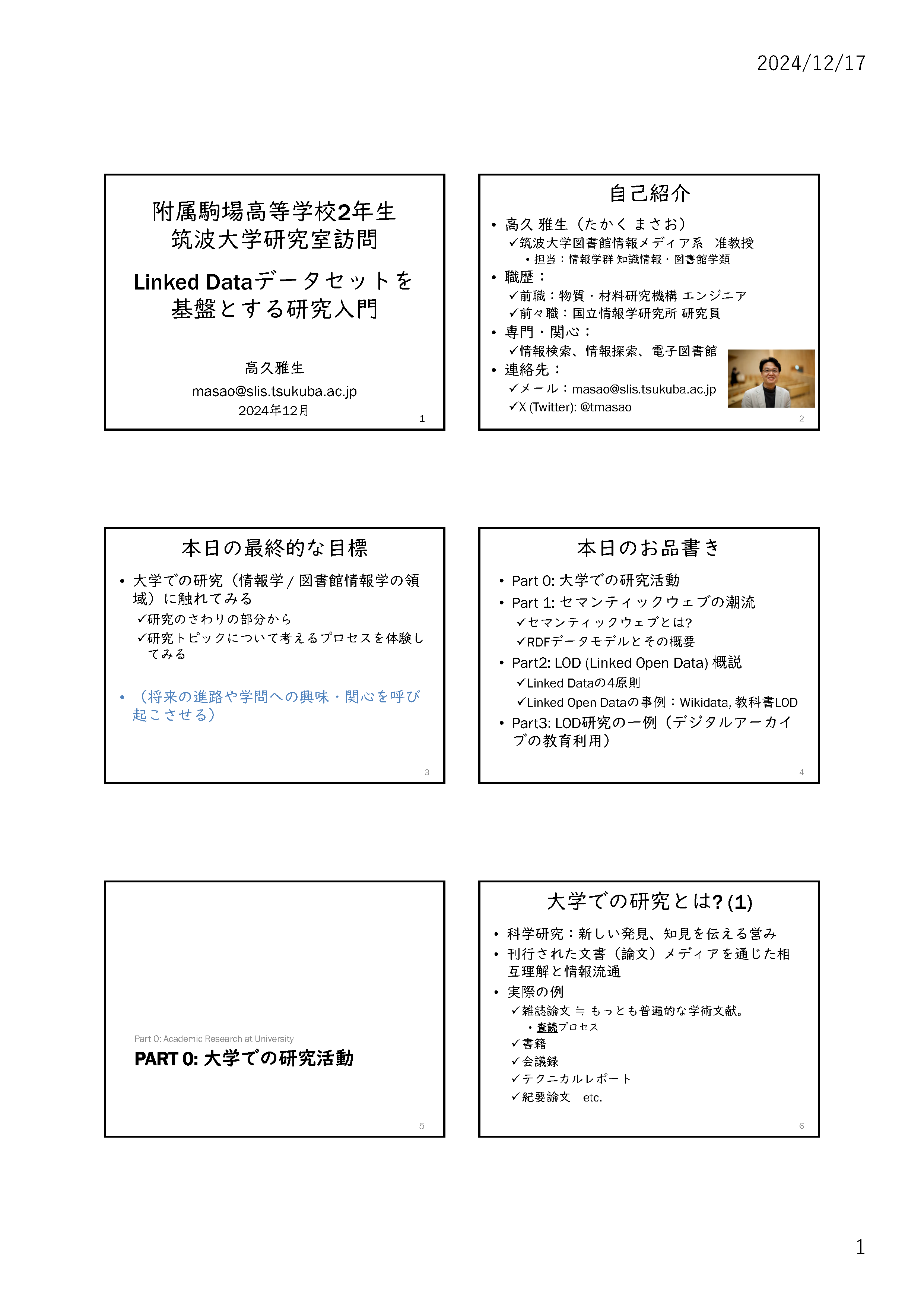 - 高久雅生. Linked Dataデータセットを基盤とする研究入門. 附属駒場高校2年生筑波大学研究室訪問. 2024-12-17.