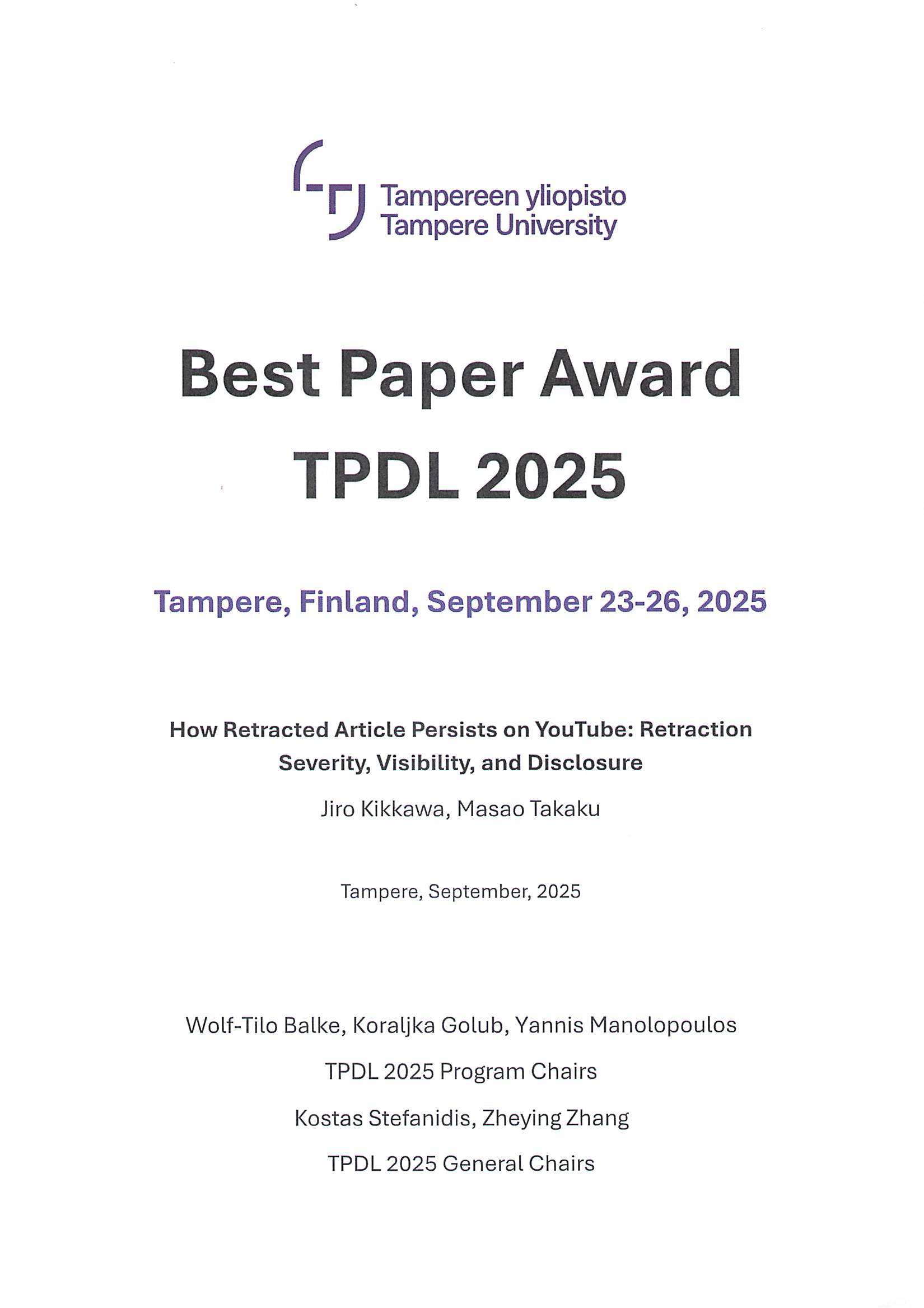 - Jiro Kikkawa, Masao Takaku. How Retracted Article Persists on YouTube: Retraction Severity, Visibility, and Disclosure. TPDL 2025, Tampere, Finland, Lecture Notes in Computer Science (LNCS), vol.16097, pp.127-144 (2025-09) https://doi.org/10.1007/978-3-032-05409-8_9