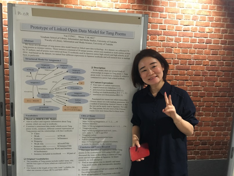- Yan Cong, Masao Takaku. Prototype of Linked Open Data Model for Tang Poems. Japanese Association for Digital Humanities Conference 2017 (JADH2017), Kyoto, Japan, pp.50-52 (2017-09)